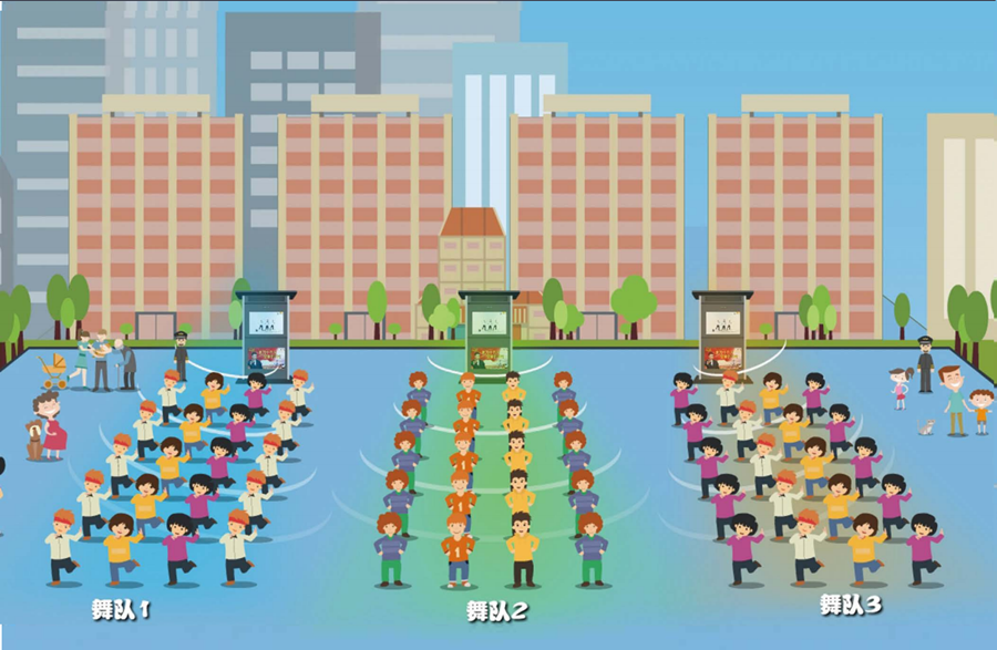 智慧舞場系統通過集成領先的定向發聲技術,實現設備發出的聲音被集中在固定區域傳播,超出范圍后,聲音大幅衰減至環保值,有效解決群眾健身活動引發的各種噪音擾民難題。