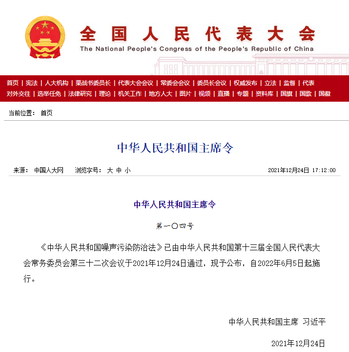 2021年12月24日,全國人大常委會會議表決通過了《中華人民共和國噪聲污染防治法》,將于2022年6月5日起施行。現(xiàn)行《中華人民共和國環(huán)境噪聲污染防治法》于1996年制定、1997年3月頒布實(shí)施。時(shí)隔20多年后,新法進(jìn)行了較大范圍的修改。與現(xiàn)行噪聲法相比,新噪聲法主要有以下幾方面的變化: