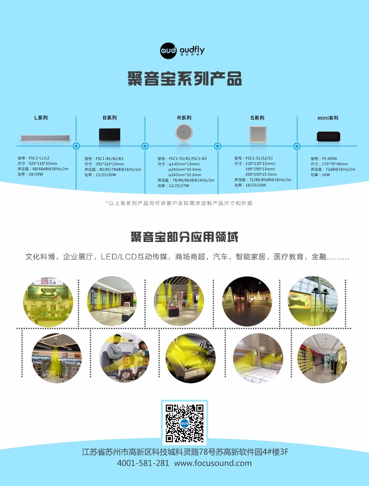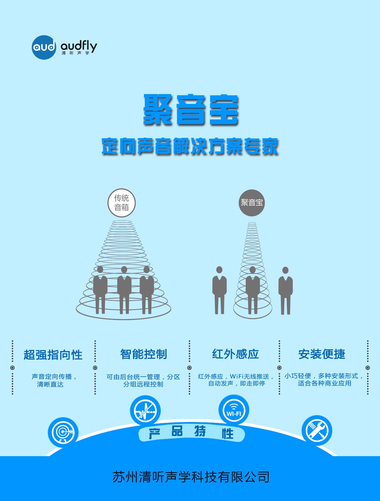 聚音寶是一款融合了定向聲技術(shù)的高科技超指向揚(yáng)聲器,憑借其聲音超強(qiáng)指向性、音源立體定位以及防治噪音產(chǎn)生等特點(diǎn),截至目前,已廣泛應(yīng)用于博物館、展廳等展覽展示工程、LED/LCD音視頻廣告集成、商場(chǎng)超市、銀行、醫(yī)院、汽車等20多個(gè)行業(yè)領(lǐng)域,提供專業(yè)的定向聲解決方案。