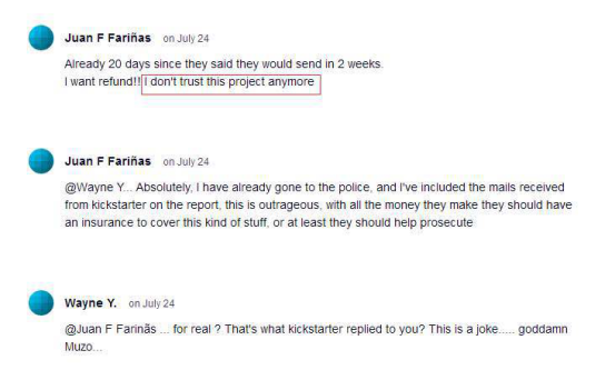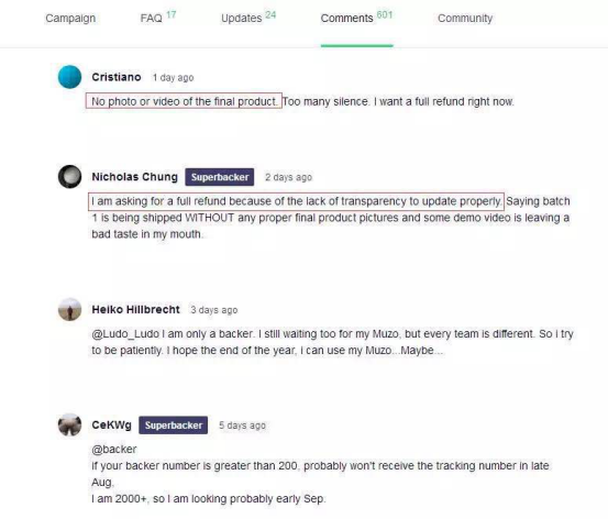由于Muzo自公布了產品理念視頻后,就再也沒有相關產品的信息流出。一開始熱情高漲參與眾籌的朋友,既不了解產品的生產進程,又查不到物流信息,紛紛對Muzo失去了信心和耐心。