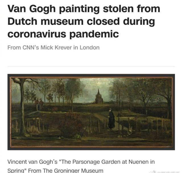 據(jù)美聯(lián)社、英國每日快報(bào)等多家媒體報(bào)道,3月30日凌晨,位于荷蘭阿姆斯特丹東部的辛格·拉倫博物館夜間遭盜賊闖入,正在展出的梵高畫作《春天花園》被盜。據(jù)悉,這件作品是該館從荷蘭北部城市格羅寧根的格羅寧格博物館借展的。作品創(chuàng)作于1884年,畫的是荷蘭小鎮(zhèn)紐南的鄉(xiāng)村風(fēng)景。據(jù)一位藝術(shù)家透露,這副畫作的價(jià)值可能高達(dá)600萬歐元。