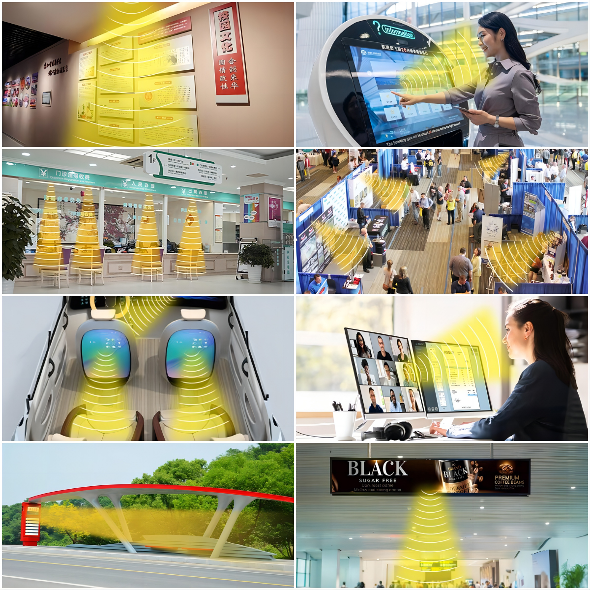 定向揚聲器應用涉及的場景也有很多,像是在在展示展覽、教育、居家、辦公、商業顯示、車載、自助終端、廣場舞、電話會議、銀行、醫院、交通、廣告傳媒、汽車、商超等多種行業中得到了廣泛應用,詳細的這里就不一一為大家介紹了,想了解更多,歡迎來電咨詢!